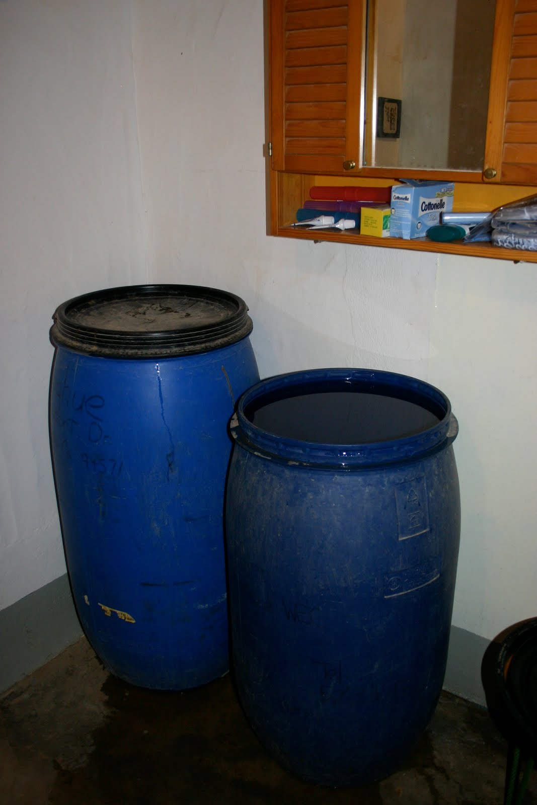 We keep a blue bucket, filled with water from the barrel, next to the shower. We use a blue measuring cup to scoop water out of the bucket and dump it on our heads in order to “wet down”. We stand in a basin in the shower, so that the basin catches the runoff, which can be used to wash our legs. Once you’re wet, then you use your soap and shampoo, followed by a rinse with the blue measuring cup.