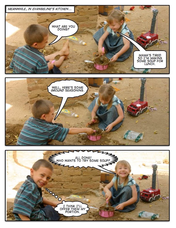 Speaking of the kids, they have been a great help during this time.  They clear the table each morning, sweep, fill up the water filter, assist in washing dirty clothes, and help take care of Athanasius at times.  Here they are below, preparing a meal together….yummm, looks good! (Click on the pic)