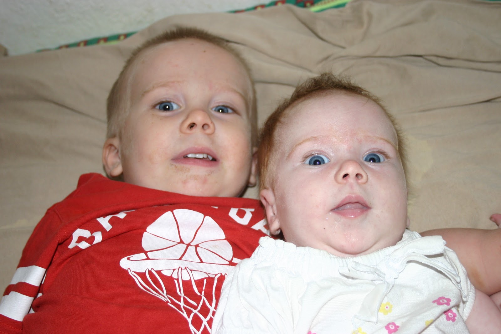 When a visitor holds Hadassah these days, you will often hear Evangeline in the background reporting, “It’s 4-2 now”. No, she hasn’t joined Nehemiah in the ranks of “Avid Minnesota Wild Fan”, she’s just letting people know about the family eye colors. It seems safe to say at this point, that Hadassah will be a part of the blue-eyed squad, joining Papa, Evangeline, and Athanasius, while Mama and Nehemiah compose the brown-eyed team. Here are two of the Blue-Eyed Bandits showing off those colors:
