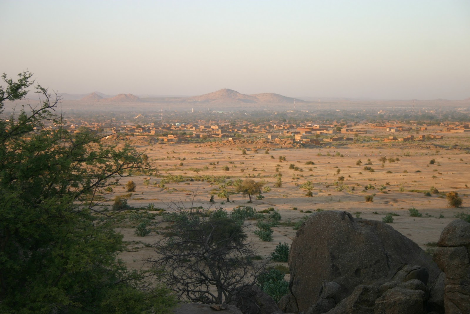 On Saturday, our team took a break from all the Annual Conference seminars and meetings and went to the hills to relax and enjoy a picnic together. There are some modest rock formations overlooking Abeche and some members of the team go there from time to time. The kids have been there a couple times, but this was Papa’s first trip. Here’s a view of Abeche from the hills: