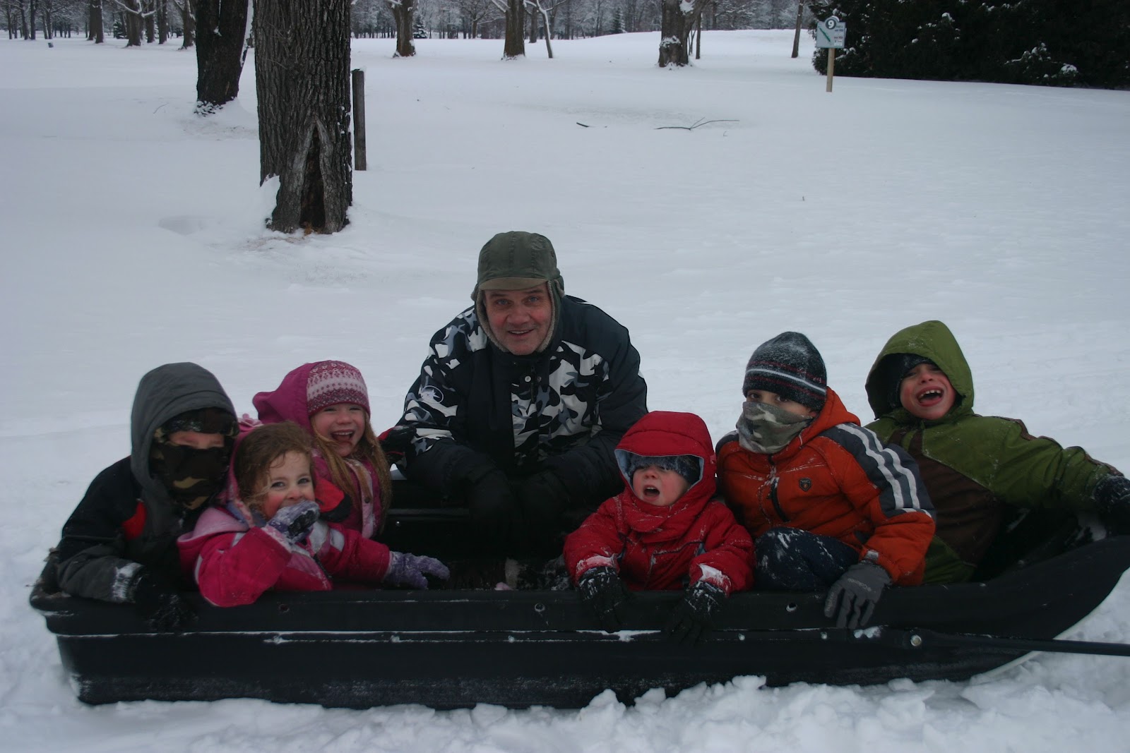 Grandpa really came through this time. Apparently, he found a toboggan that could fit a large amount of grandkids in it. So yesterday, we loaded up six of them and he connected the toboggan by rope to the back of a Polaris Ranger and we went out for a ride in the open spaces of Roseau.