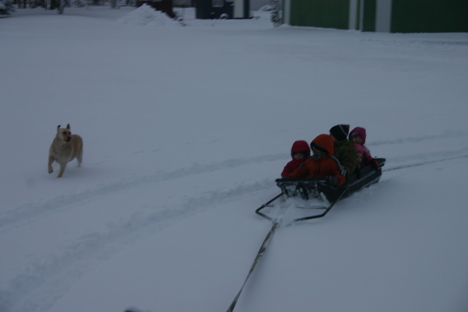 Along the way, a dog decided to join in the fun and chase the kids in the sled:
