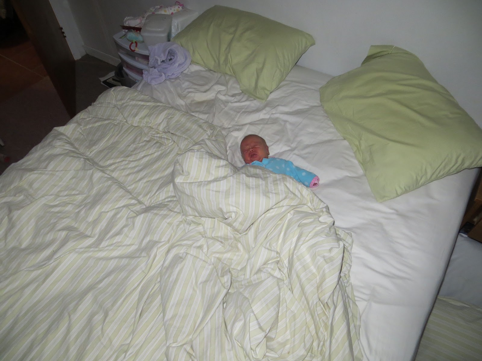 the living room area and Sonja fell asleep on the couch. I awoke at about 1 AM and couldn’t resist the picture of little Perpetua in our giant, queen-sized bed.