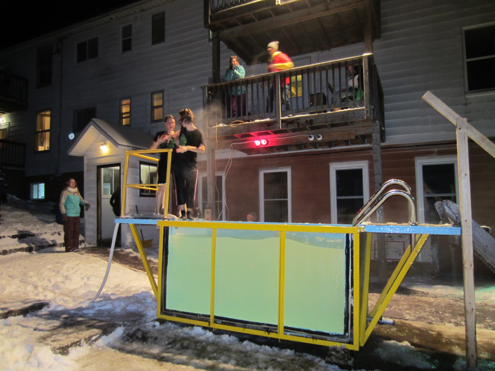 The winter camps include speakers, testimonies, hockey, broomball, campfires, etc. But the craziest event of the weekend is the Saturday night polar plunge for all who are willing. At freezing temperatures of about 0℉ outside, a large tank is filled with cold tap water. Any willing campers, Bible students, or even language students jump in as loud music plays and people cheer.