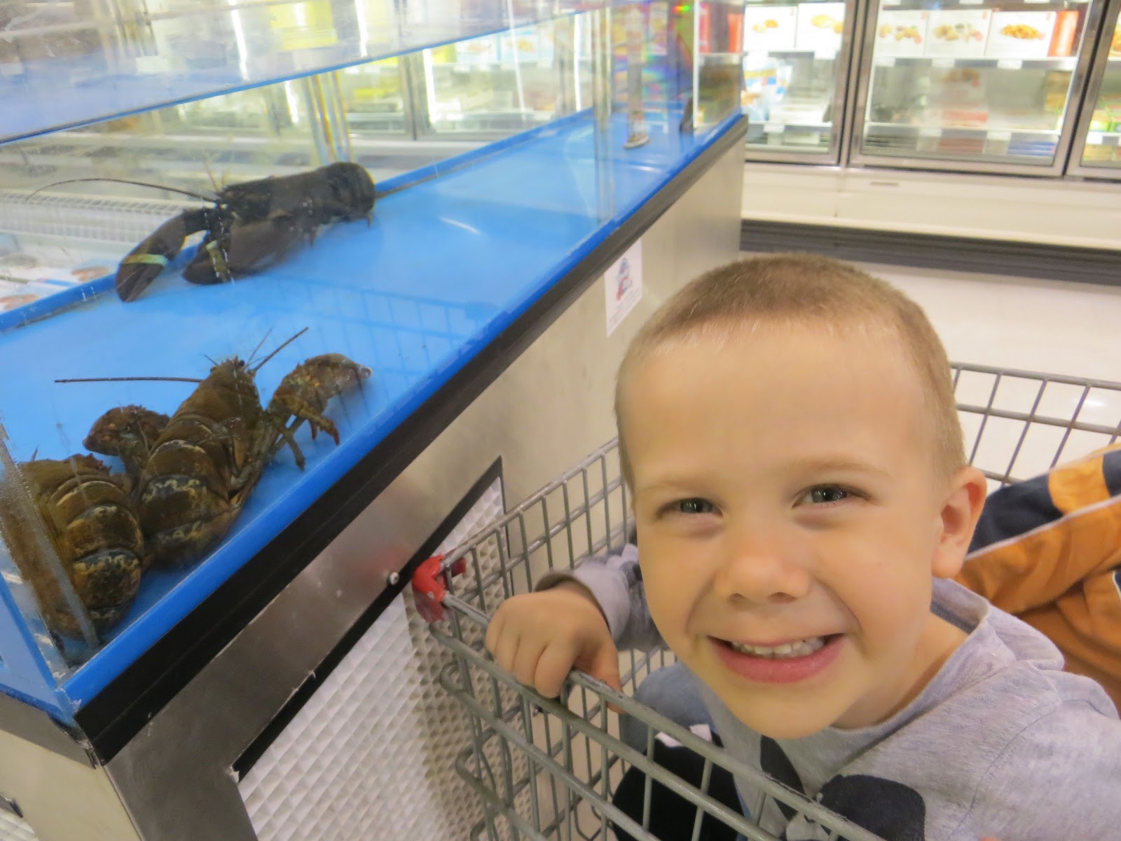 In an effort to do something special with each of the kids during the week, I started taking Athanasius to the grocery store with me. He loves the one on one time and we discovered something special next to the meat section. Lobsters!