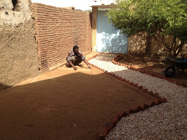 The other thing that came together last week was the yard. When we arrived, there was junk everywhere, glass, tiles, and bones. Obviously it was not a super high priority compared to water, sleeping and bathroom needs but Jacob had a friend come to help us clean up the yard. This involved breaking up the old ground and leveling it, bringing in some soft sand, and then adding some bricks and white rock to construct a pathway and dry area in front of our veranda. Now, I love sitting on the veranda looking at our small little yard. Here’s a picture of it: