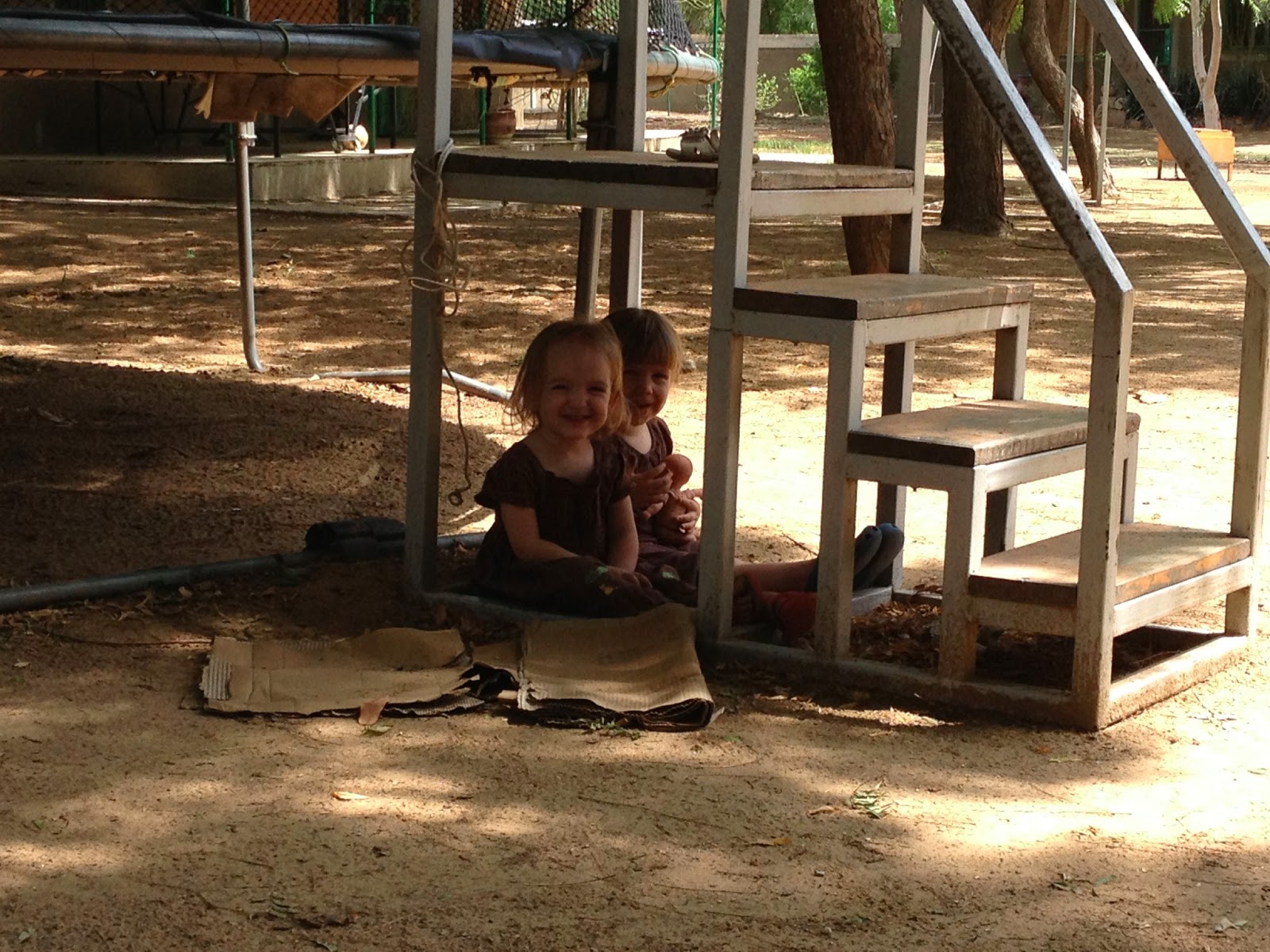 I’m hoping that the ATM at the bank will work today as we have about $20 left in our wallets. Here’s a picture of Hadassah and Justus playing under some steps together one day in N’Djamena last week: