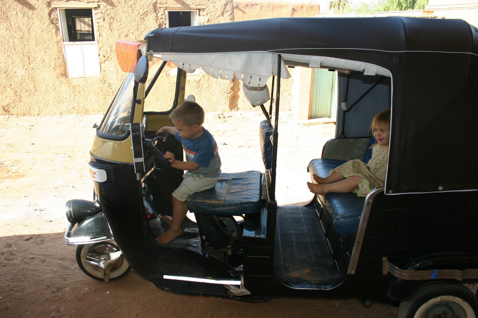 While we await a vehicle for our family (I will return to the capital to pick it up in a couple weeks), we have managed to get around town as a family in the Abéché-renown rickshaws. I think these little golf cart-type vehicles get their origins out of Asia buggies that were often pulled by a person with people sitting behind. You can find these rickshaws in both Sudan and here in Eastern Chad (as well as other parts of the world). This is a younger Nehemiah and Evangeline sitting in one in Sudan: