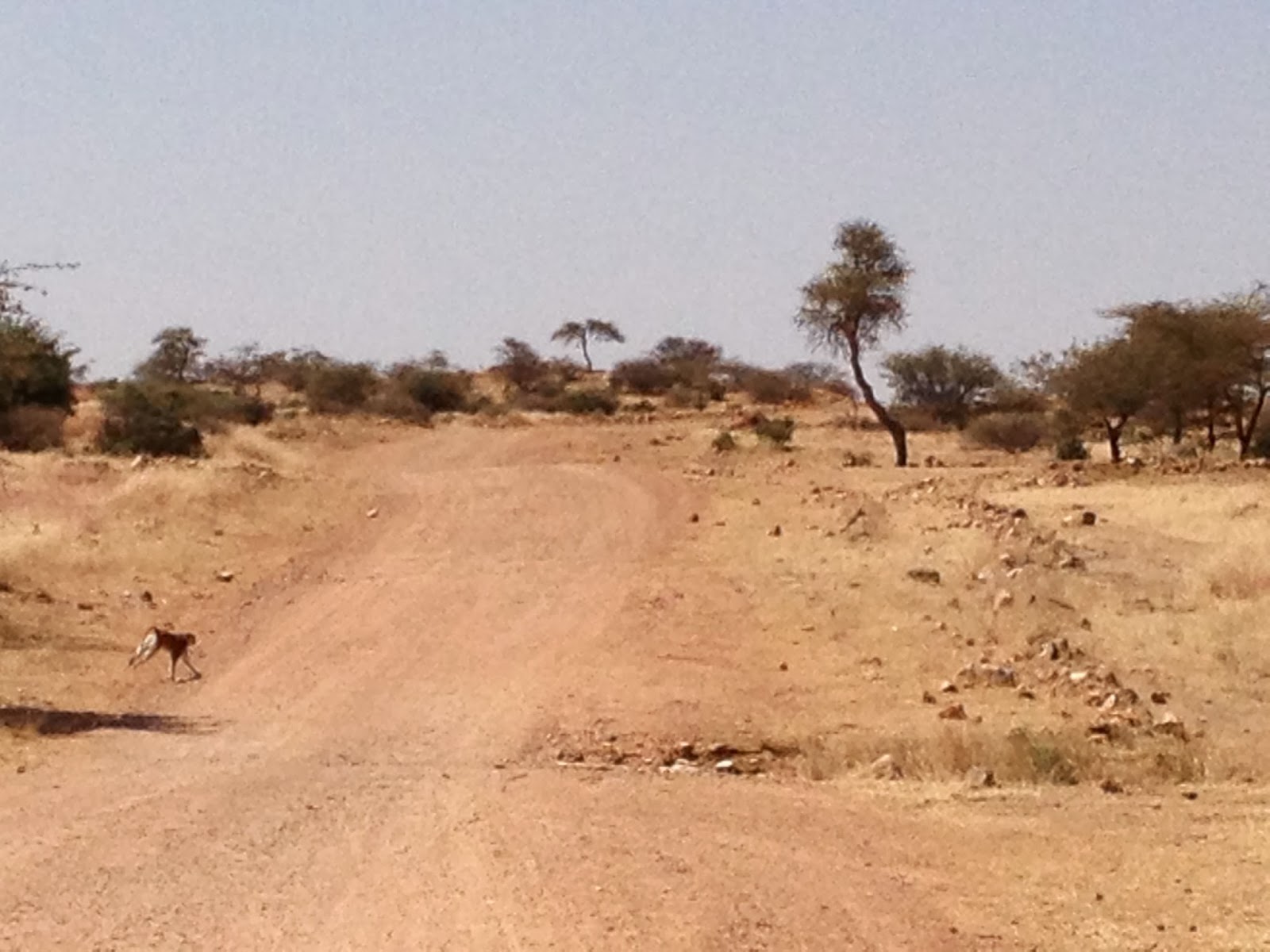 Imagine my delight while driving to Iriba the other week, when I spotted what appeared to be an animal similar order Prozac to a dog, but with an obviously contrasting gait and build, crossing the road far in front of us. I wondered if it might be a baboon. Then two smaller ones crossed and there was no doubt. I quickly grabbed my camera and Abdulai pointed out that one was crossing the road behind us. See if you can spot it: