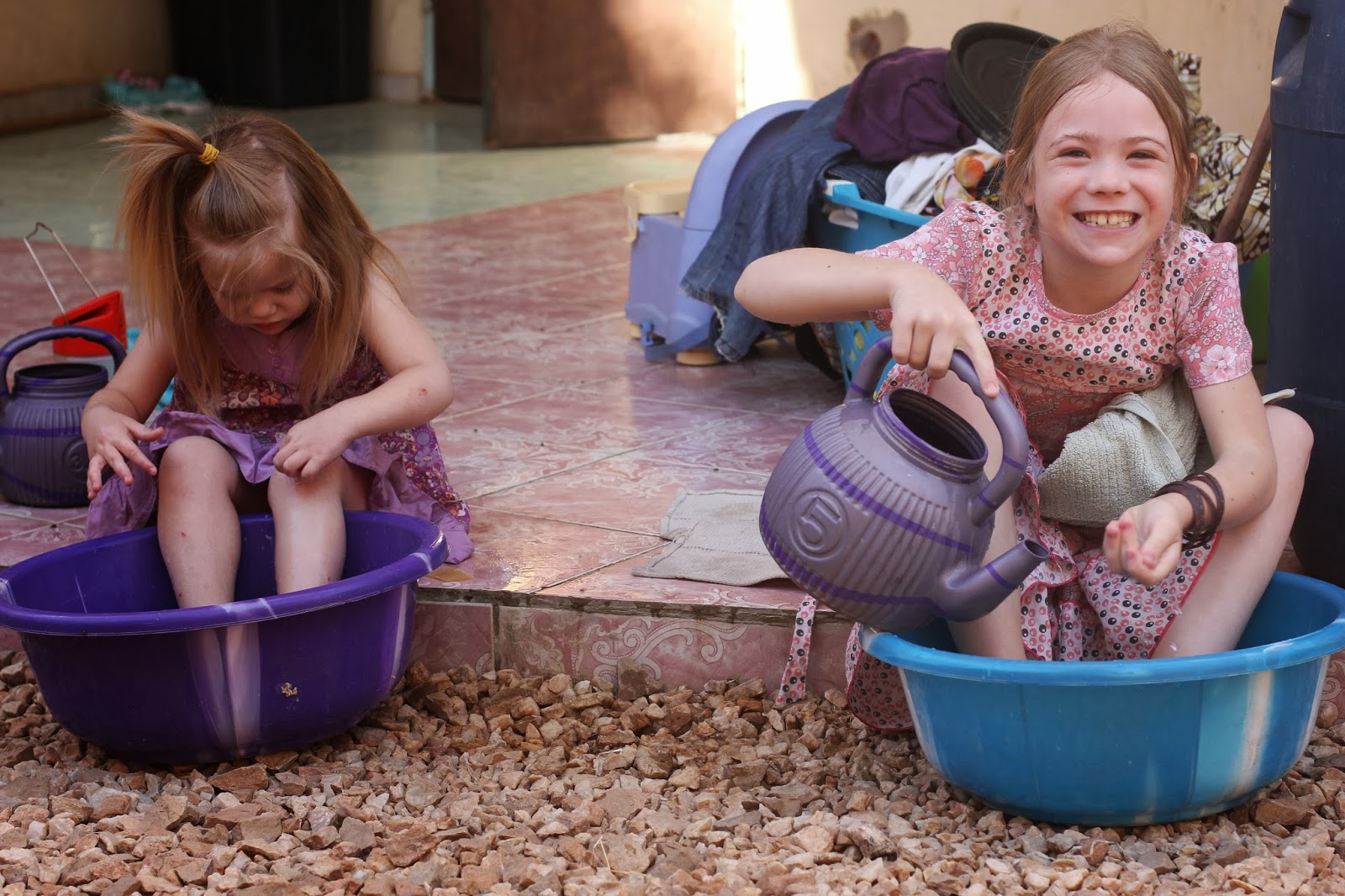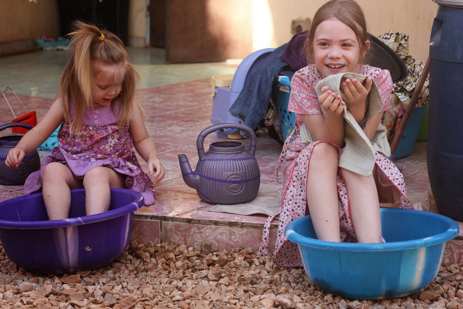 My apologies if you clicked on this title hoping for a very spiritual discussion on servant leadership. It’s mainly just about how dirty my kids’ feet are. It’s hard to get Nehemiah, Evangeline, Athanasius, and Hadassah (Perpetua is not as mobile yet) to keep their sandals on, which inevitably leads to really brown feet.So, one thing they have become very skilled at is washing their feet. On the back veranda, they pull out a basin, fill it with water, grab a bar of soap, and start scrubbing. Here’s the Dolly and the Spunkster in the middle of a wash: